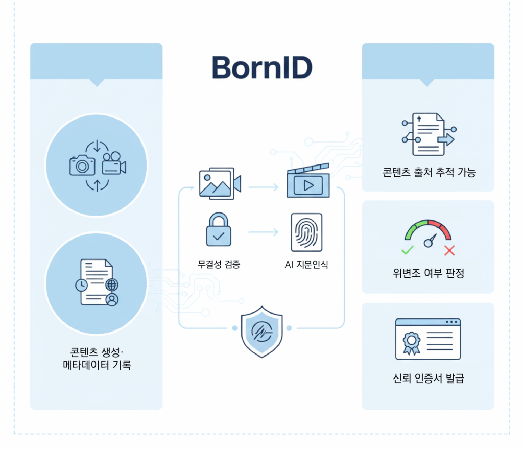 디지털 콘텐츠의 조작이 쉬워지고 허위정보가 빠르게 확산되는 환경에서 콘텐츠의 출처와 변경 이력을 신뢰할 수 있는 방법으로 기록하고 검증할 필요성이 증가하고 있습니다. 이에 따라 BornID는 C2PA 개방형 기술 표준을 기반으로 다음과 같은 가치를 제공합니다.