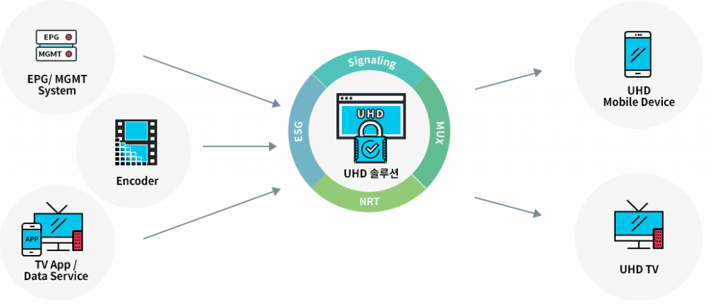 UHD 방송 솔루션은 국내 지상파 UHD(Ultra High Definition) 방송 서비스를 위한 차세대 방송 표준인 ATSC 3.0 기반의 솔루션입니다. ATSC 3.0 표준은 IP(Internet Protocol)기반 방송/통신망의 하이브리드 방송 환경을 통하여 기본 TV서비스뿐 아니라 서비스 가이드, HTML5 앱 서비스, 주문형비디오, 모바일 연동 서비스, 동적 광고 등의 다양한 부가 서비스를 제공할 수 있습니다.
